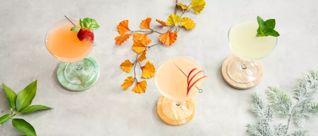 - For the fall gin sour, gently muddle 2-3 apple slices in a shaker and add a dash of Fee’s® Old Fashioned bitters. Add gin, lemon or lime juice, simple syrup and ice, and shake until well chilled. Double strain in a coupe and garnish with apple slices.