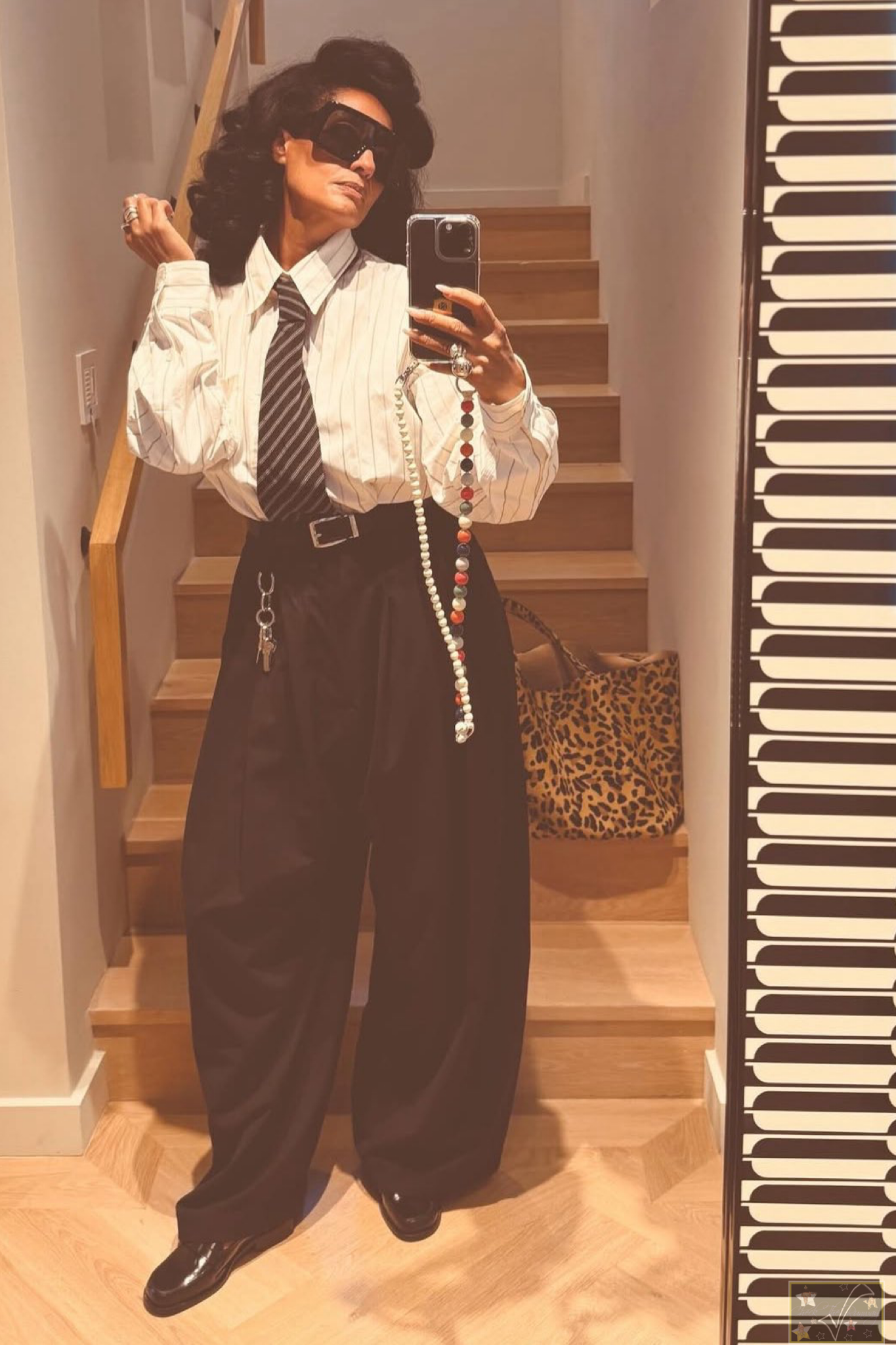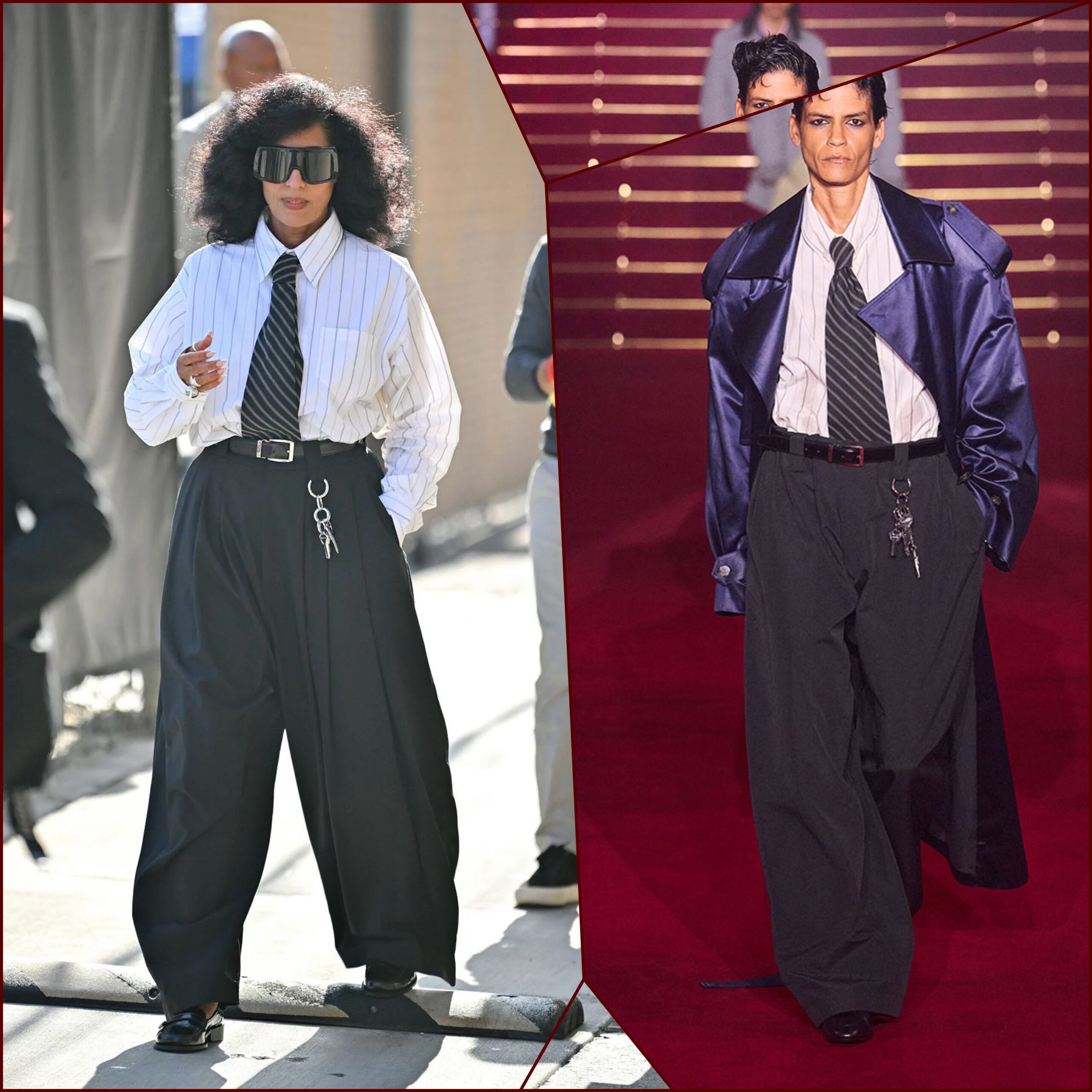 Tracee Ellis Ross always serves pure style goals! She stepped out for Jimmy Kimmel Live this week in an absolutely flawless look by none other than Willy Chavarria. The bold, architectural silhouette was a masterclass in modern power dressing, proving once again that Tracee is a fashion force to be reckoned with. Her choice to champion a visionary designer like Chavarria makes this more than just an outfit, it’s a major style statement. We are completely obsessed! The oversized gray slacks, striped button down and tie seemed simple however, the cut was on point and interesting. Her big hair and oversized shades added that twist of feminine baddie that is always needed. I can always count on Tracee to punch the envelope and this look was no different.