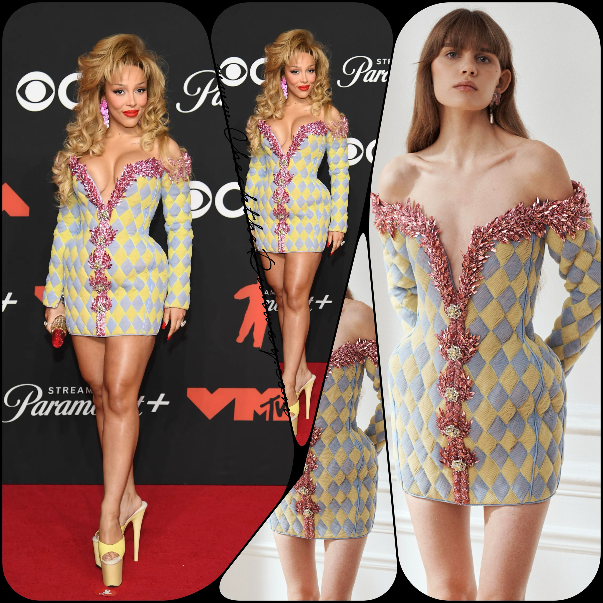The Look: Doja Cat leaned into pure fantasy with a pastel harlequin Balmain mini dress. The silhouette was sharp, playful, and futuristic, structured shoulders, fitted bodice, and glistening crystal embellishments in shades of lilac, yellow, and fuchsia.